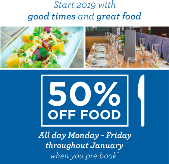 Enjoy 50% off* food all day Monday - Friday throughout January when you pre-book.