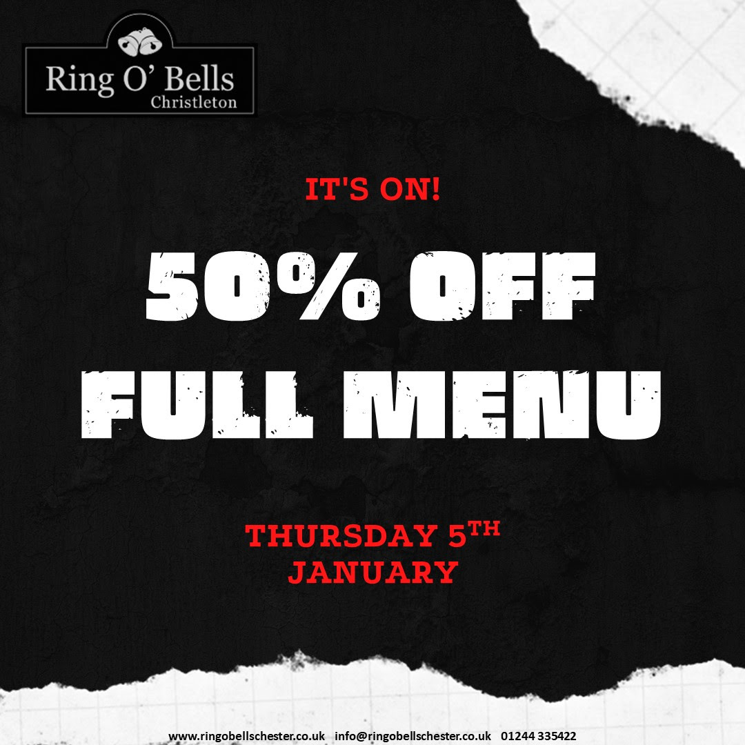 Great news! Enjoy 50% off the main menu on Thursday 5 January at the Ring O'Bells, Christleton.