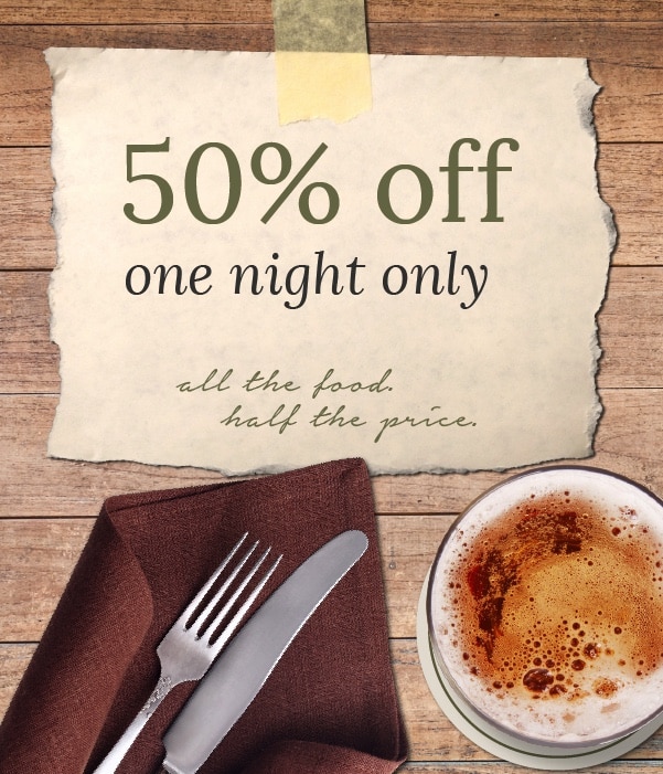 Join The Chester Fields Country Pub & Restaurant from 3.00 pm on Tuesday 15 February 2022 for a ‘one night only’ 50% off night. All the food. Half the price. It doesn't get any better than that.