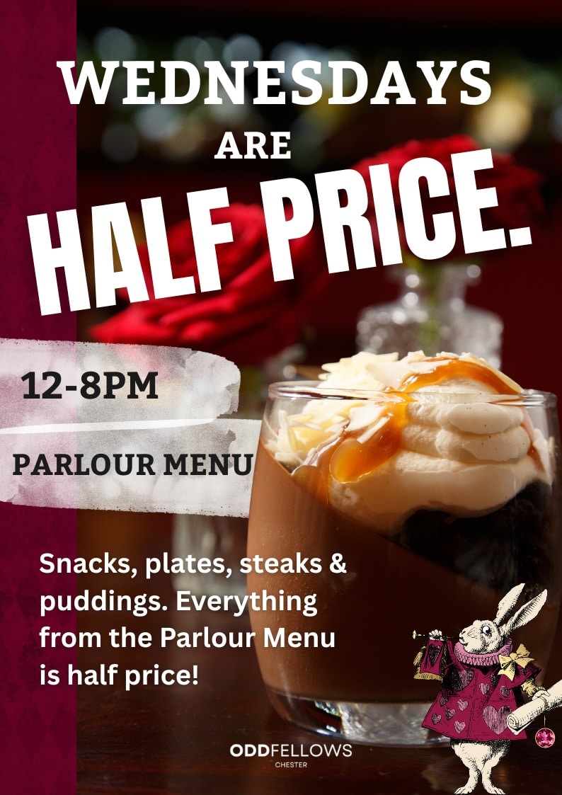 Alice’s Parlour is a topsy-turvy escape from the ordinary, located in Oddfellows Chester, serving delight after delightful bite and every Wednesday the bill is 50% lighter.