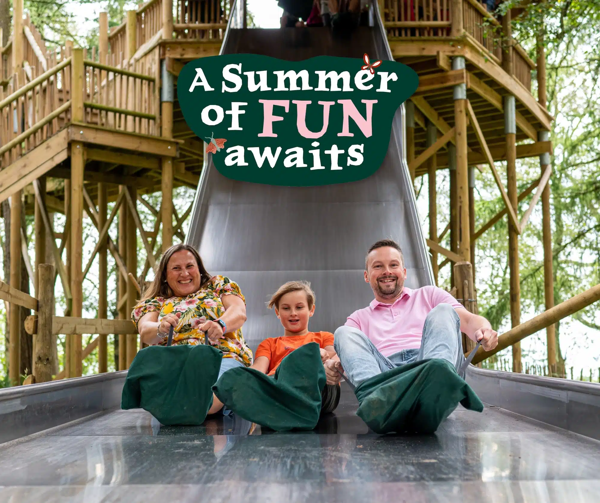 Whoosh through the trees on the zip wires, brave the highest slides and create memories together as you master the towering treetop mazes!