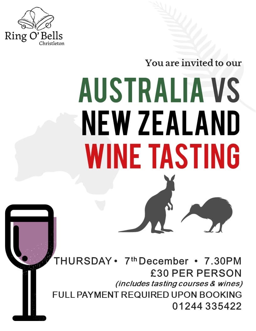 Enjoy an evening of Australia v New Zealand wine tasting on Thursday 7 December at The Ring O'Bells.