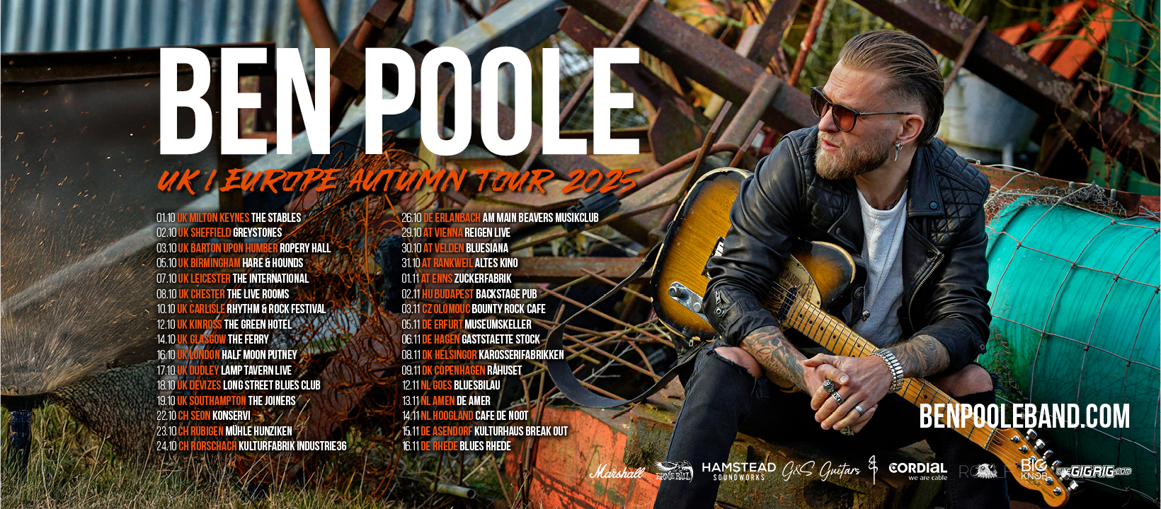 BEN POOLE is an internationally applauded, award winning blues, rock and soulguitarist, singer and songwriter hailing from the United Kingdom. Nominated as one of the“Best Blues Guitarists in the world” just prior to the 2 year pandemic hiatus alongsidenames such as Eric Clapton, John Mayer, Buddy Guy, Robert Cray, Joe Bonamassa & many more by the USA’s ‘Guitar World Magazine’ Ben Poole is very much at the forefront of the talent rich blues/rock scene on a worldwide scale. A now internationally recognised touring and recording artist since beginning his career playing on the local UK blues circuit aged 16, Ben Poole has also received critical acclaim from some of the most renowned blues and rock musicians in the world such as Jeff Beck, Gary Moore, John Mayall, Beth Hart, Kenny Wayne Shepherd, Walter Trout, Richie Kotzen, Philip Sayce and many more. Besides this he has graced the covers of, as well as receiving awards and accolades from some of the most respected publications and organisations, including being voted in the top 15 best blues guitar players in the world a few years ago by the biggest selling guitar magazine in Europe (Total Guitar Magazine/Music Radar).“Truly astonishing” – Classic Rock Magazine“F***ing amazing!” – Jeff Beck“A REALLY good player” – Gary Moore“So amazing!” – Beth Hart“Killer!” – Kenny Wayne Shepherd“Unbelievable!” – Richie Kotzen“I’m a big fan!” - Philip Sayce“Exudes class & prowess” – Guitar Techniques Magazine“Ben Poole is the full package” – Maverick Magazine“Definitely one to watch” – Guitarist Magazine“A really fresh sound and style” – Paul Jones (BBC Radio 2)“This is a young man to look out for as he is no doubt a rising talent” – Blues Matters Magazine