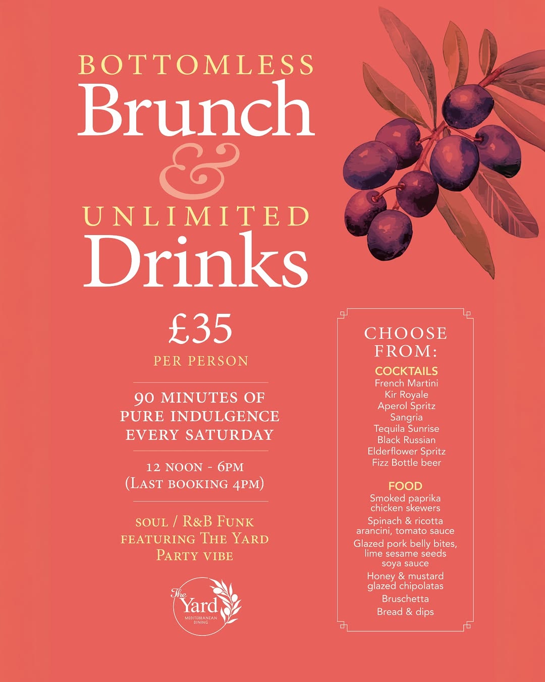 The Yard, a family owned and operated vibrant Mediterranean restaurant bringing you bold flavours, relaxed dining, and an exciting selection of small plates is the place to enjoy Bottomless Brunch every Saturday.