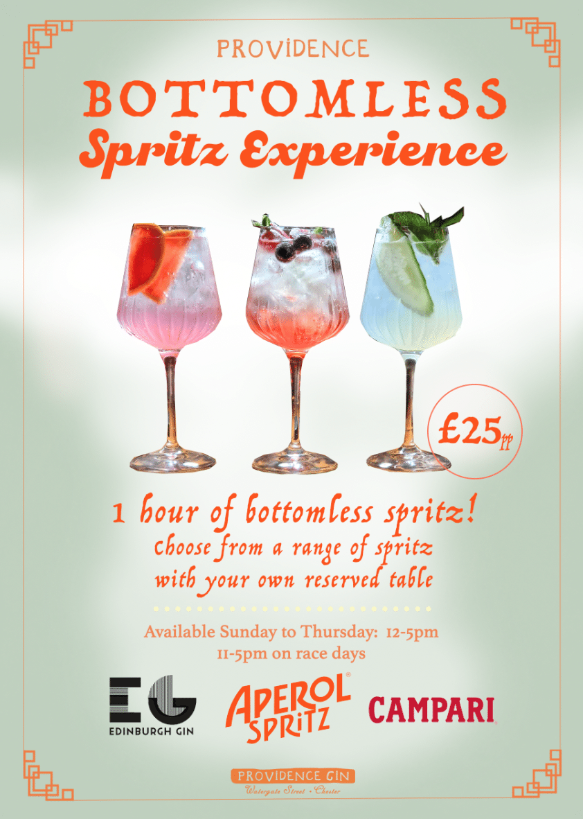 Providence Gin is a Gin Bar set on Chester's iconic Watergate Street in Providence House where you can enjoy a Bottomless Spritz Experience.