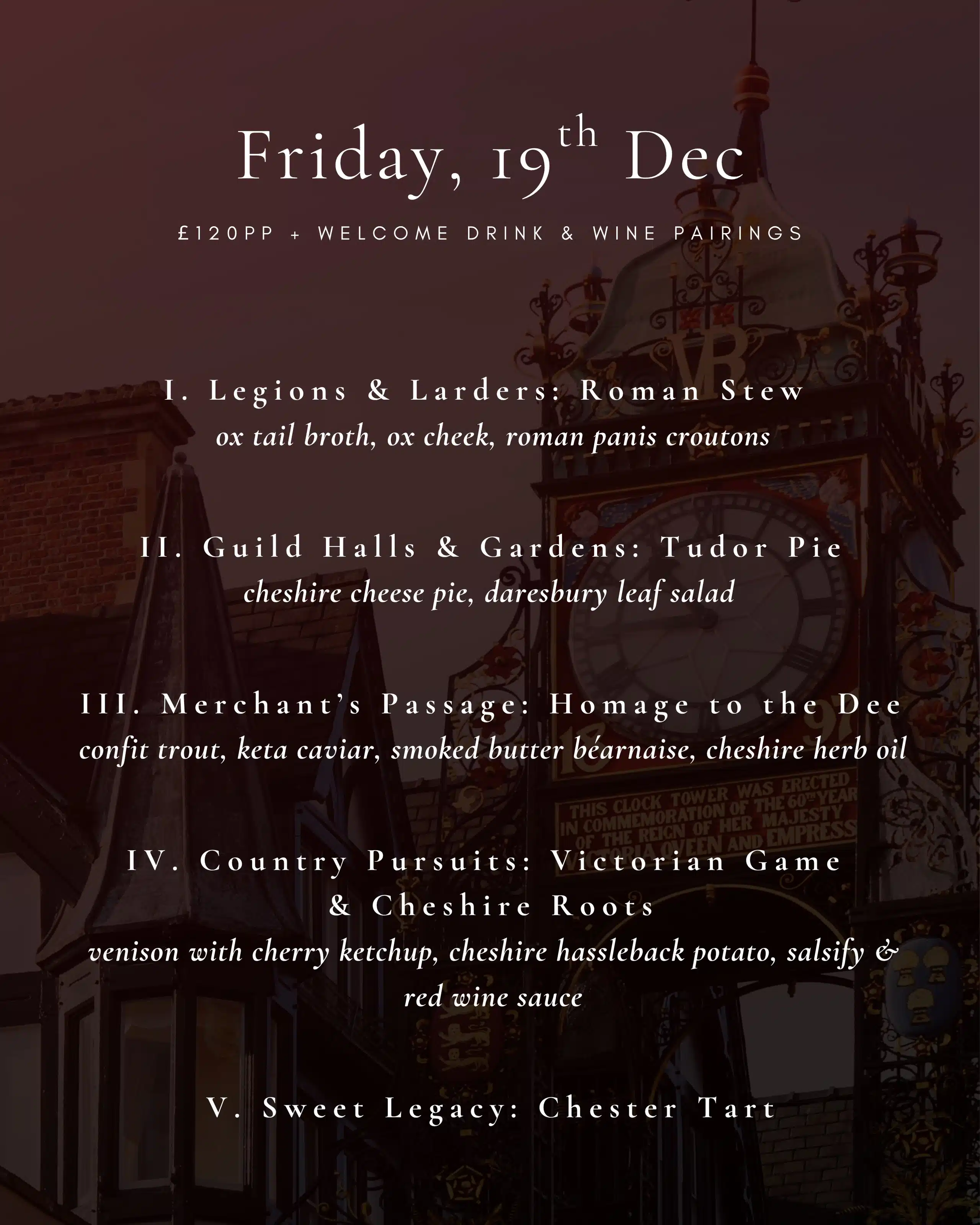 Expect an evening that celebrates the flavours, stories, and spirit of this historic city through five beautifully crafted courses, each inspired by Chester’s rich past and vibrant present. Every dish is paired with a carefully chosen wine and a festive welcome drink to enjoy on arrival.