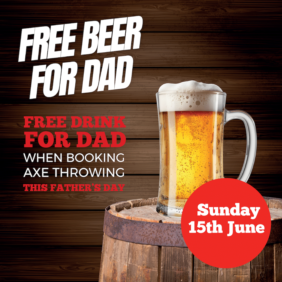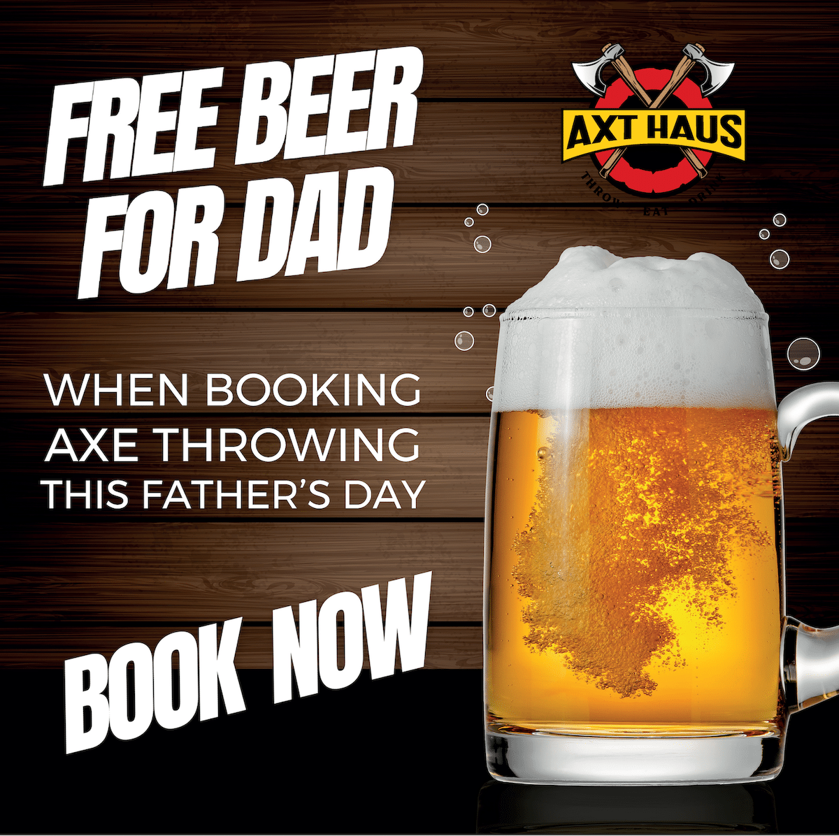 When you book your axe throwing for Father's Day, your Dad get's a free beer! (minimum of 2 people booking).