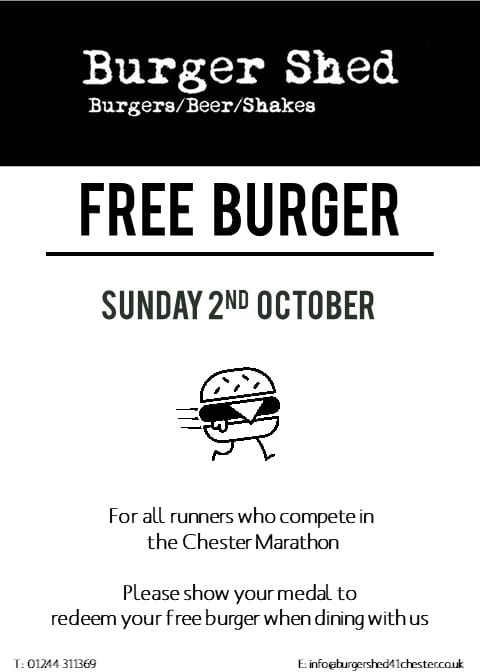 Burger Shed41 is a US-inspired UK take on a New York Burger Bar with an industrial upcycled interior, located in the heart of Chester on Bridge Street and just the place to celebrate your Marathon success with free pizza!