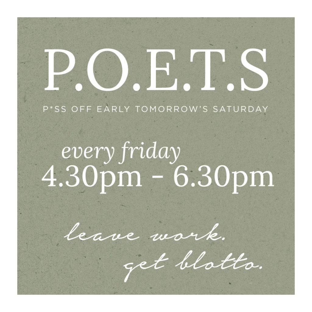 We’re not going to bore you with a night of drab, put-you-to-sleep, snooze alert poetry. Instead you get your weekend off to a wonderful start with 25% off all drinks from 4.30pm to 6.30pm.