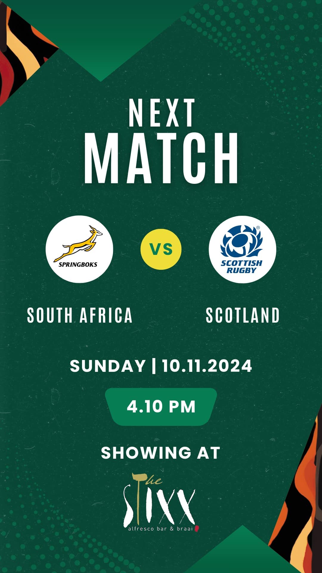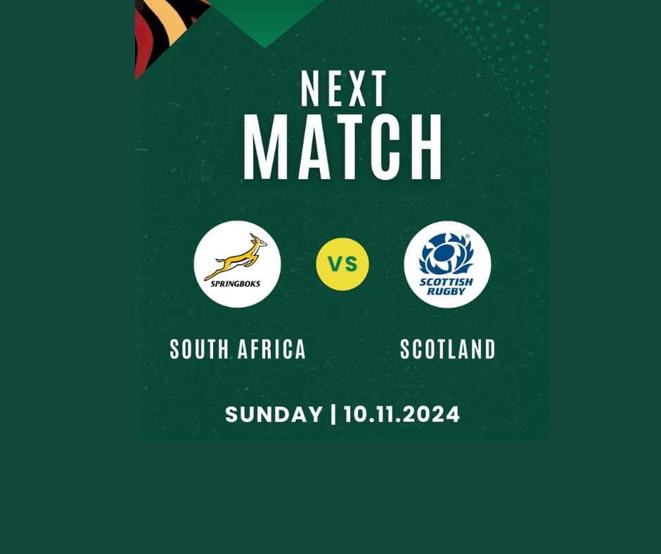 Enjoy Springboks v Scotland on Sunday 10 November, with a 4.10 pm kick off get settled early for pre-game drinks and braii.