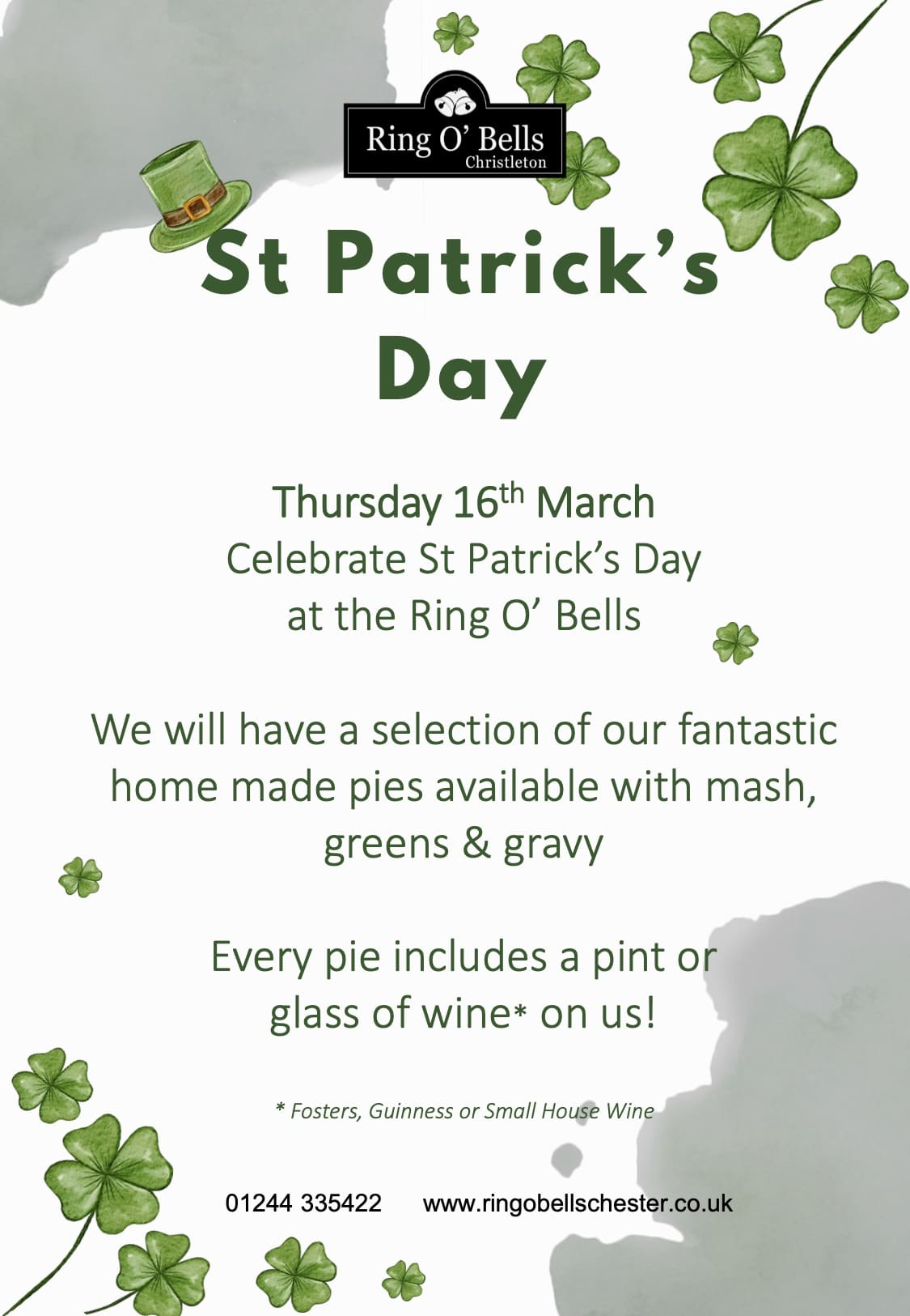 Celebrate St Patrick's Day on Thursday 16 March at the Ring O'Bells in Christleton.