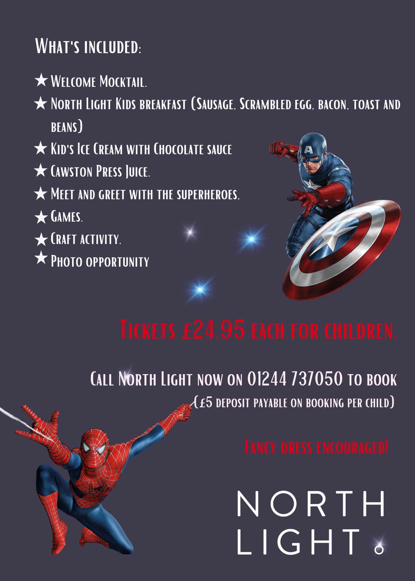 Every super hero will enjoy a welcome Mocktail, North Light Kids breakfast (Sausage, Scrambled egg, bacon, toast and beans), Kid's Ice Cream with Chocolate sauce , Cawston Press Juice. There will also be a meet and greet with the Super Heroes, games, craft activity and a photo opportunity.