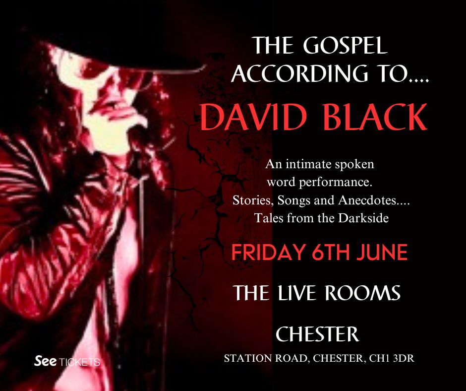 The Gospel According to… David BlackSanctum Sanctorium – The Darkside of the 80’s - vocalist and goth provocateur David Black – A candid spoken word performance with songs and anecdotes. Darkly humorous, often poignant and always risqué. Stories from a misspent life in the business we call show. Tales from the Darkside of Rock n Roll. Fiendishly entertaining