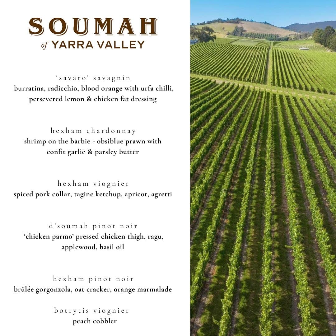 The specially curated menu by Jay brings Australian flair to the table, paired with Soumah’s exceptional wines selected to showcase how precise craftsmanship and terroir create wines bursting with character and depth.