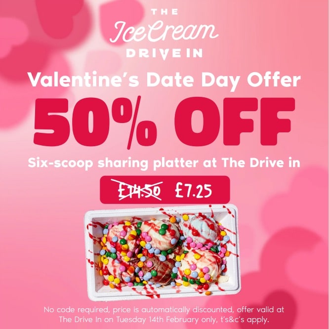 Visit The Ice Cream Drive-in on Valentine's day and a sharing platter is only £7.25 which is a whopping 50% off!