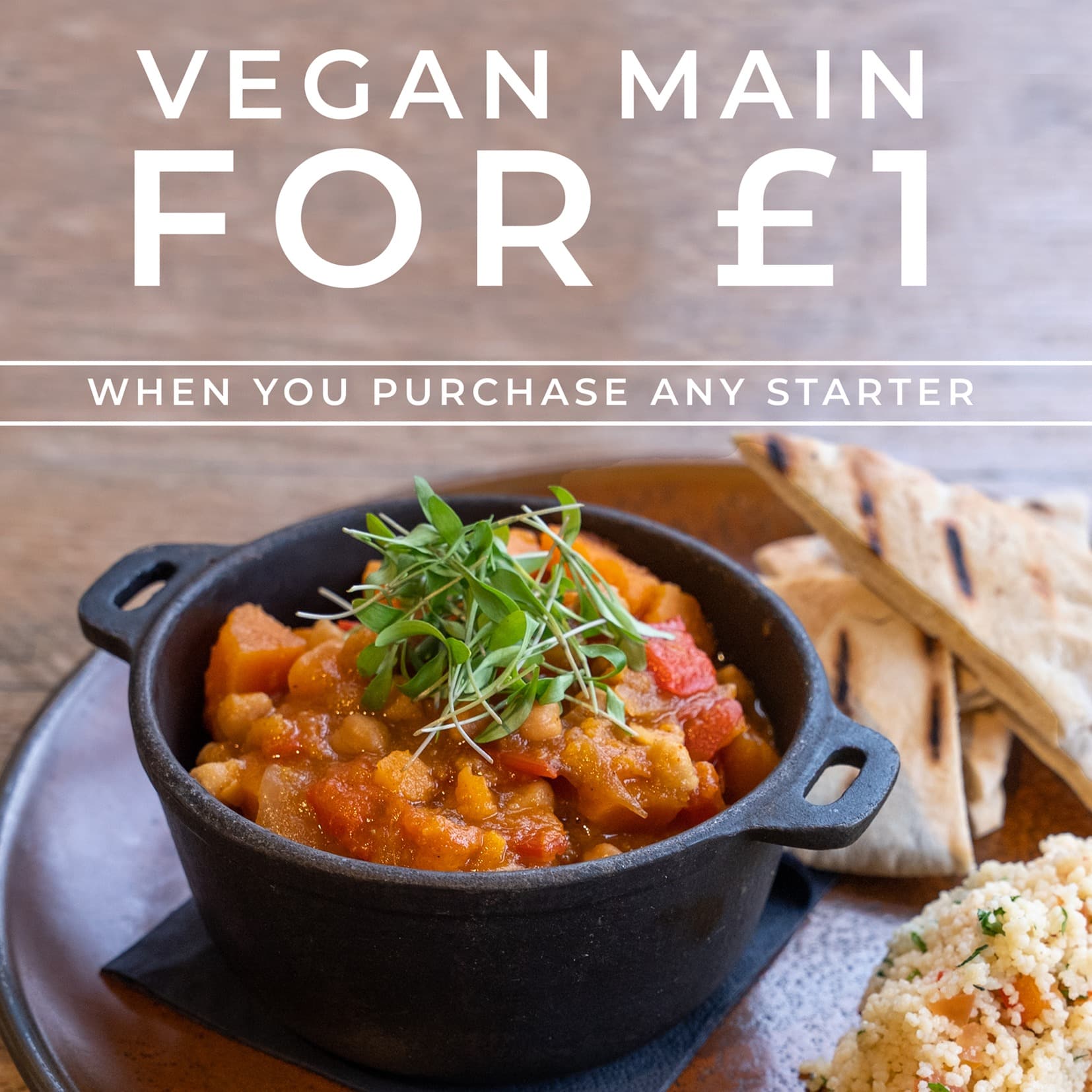 Buy any starter and get a vegan main for £1. This offer can be claimed once per person, per day. Bookings must be made online, quote ‘£1VEGAN’in the booking comments. Available Sunday – Friday from 3 January until 9 February 2024. Excludes Sunday roasts. Subject to availability. Cannot be used in conjunction with any other offer,promotion, set menu or events apart from 50% off offer. Cannot use any specialvouchers e.g. Cannot use Black Friday vouchers with this offer.