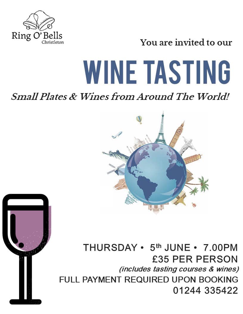 The Ring O’ Bells, a country pub with a warm and welcoming atmosphere, set in the heart of the charming Cheshire village of Christleton is hosting a Wines From Around The World wine tasting on Thursday 5 June.